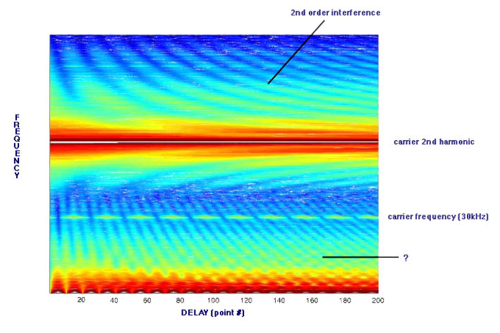 Figure: An example of analysed data from an underwater acoustic second order interference experiment. A vertical section is a logarithmic plot of the Fourier transform of a four-time fourth-order correlation. The horizontal axis is a variable delay that is built into the experiment, making this a form of spectrogram. The second order fringes show up here as the hyperbolic features in the upper part of the contour plot. However, many other features seen here are puzzling (such as that indicated by "?")